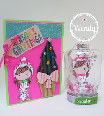 Wendy nos sorprende con una tarjeta y una bola de nieve para la cual reciclo un frasco. Ella adorno sus proyectos con Kidz winter girl